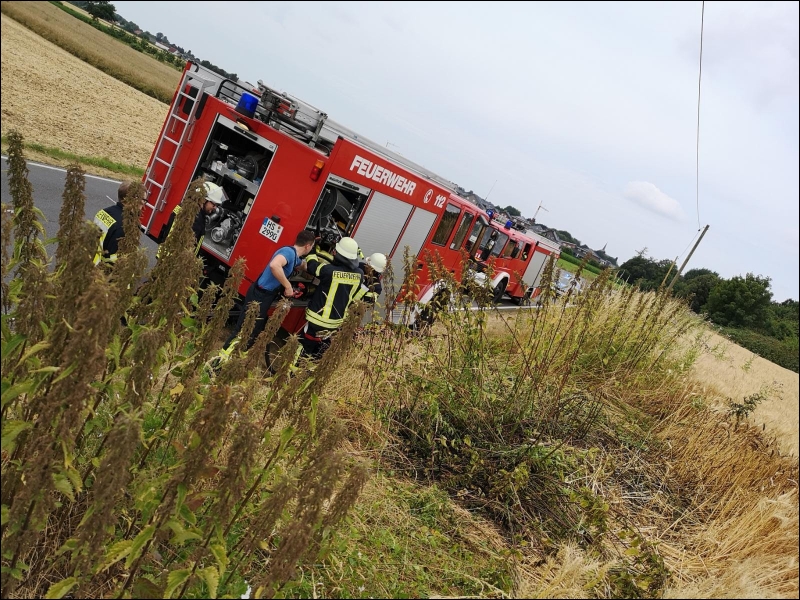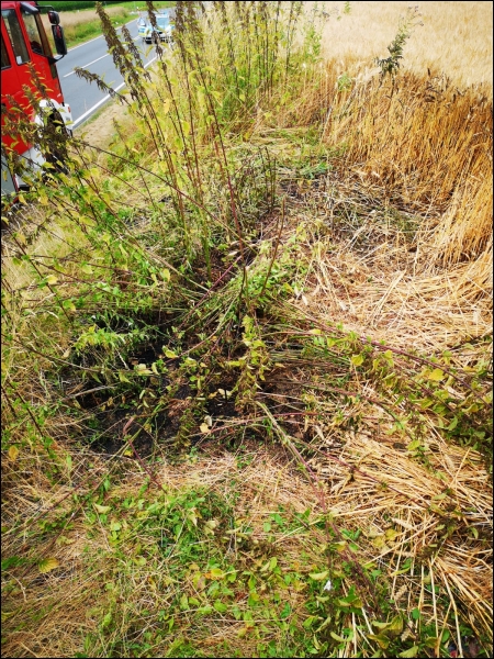 Vor Ort stellten die Einsatzkräfte fest, dass die Böschung der Kreisstraße 3 am Rande eines Getreidefeldes auf einer Fläche von etwa vier Quadratmetern in Brand geraten war. Dank der schnellen Alarmierung der Feuerwehr und der dadurch resultierenden schnellen Brandbekämpfung konnte ein Übergreifen auf das Getreide verhindert werden.