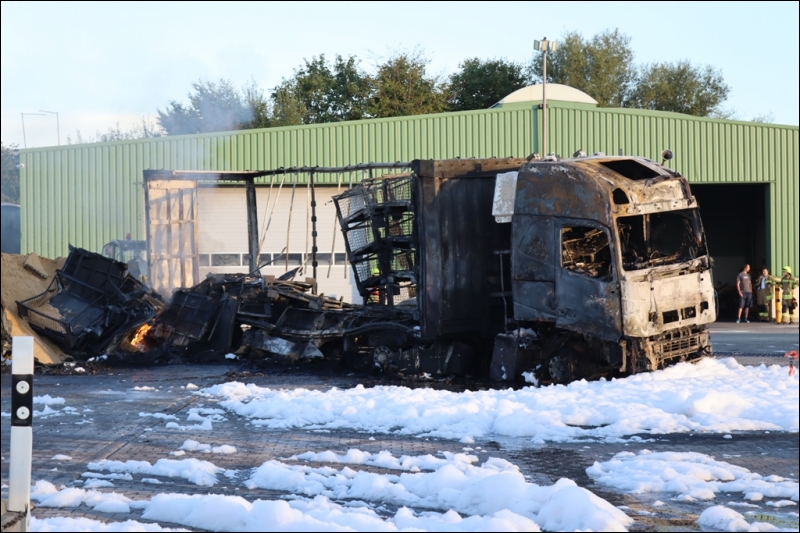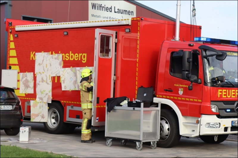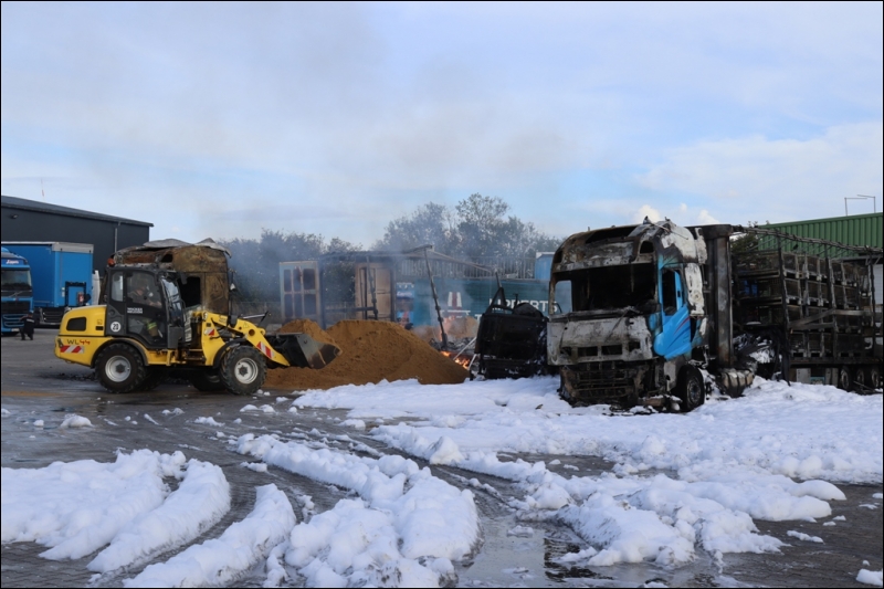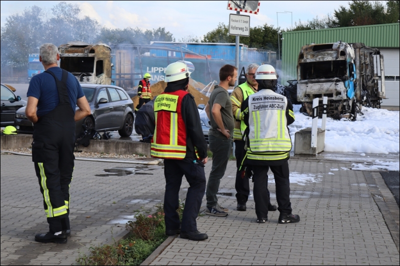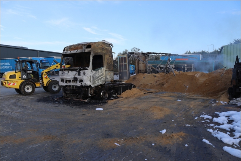Bereits auf der Anfahrt zur Einsatzstelle konnten die Feuerwehrleute aus der gesamten Gemeinde Gangelt dichten Rauch über den Ortsteil Birgden aufsteigen sehen. Aus bislang ungeklärter Ursache war in einer Spedition am Hoferweg ein Sattelzug in Brand geraten. Das Feuer griff äußerst schnell auf die beiden angrenzenden Sattelzüge über, sodass bei Eintreffen der Feuerwehr gleich drei Sattelzüge in Vollbrand standen. Durch die enorme Hitze drohte das Feuer auf Gebäudeteile und weitere Fahrzeuge überzugreifen. Bei dem Versuch schlimmeres zu verhindern, zog sich zudem ein Mitarbeiter der Spedition schwere Verbrennungen zu und musste zur weiteren Behandlung in ein nahe gelegenes Krankenhaus transportiert werden. Aufgrund der enormen Rauchentwicklung wurde der ABC-Zug des Kreises Heinsberg alarmiert, um Messungen auf Gefahrstoffe im Wirkungsbereich der Rauchwolke durchzuführen. Gleichzeitig wurde zur Vorsicht die Bevölkerung vor den Rauchgasen über die Warnapp Nina und über Radiodurchsagen gewarnt. Zusätzlich zu einem massiven Löschangriff wurden die angrenzenden Gebäude mit einer so genannten Riegelstellung geschützt. Hierzu wird eine Art Wasserwand zwischen den brennenden Lkw und der zu schützenden Halle aufgebaut, um so die Wärmebelastung für die Halle zu minimieren.