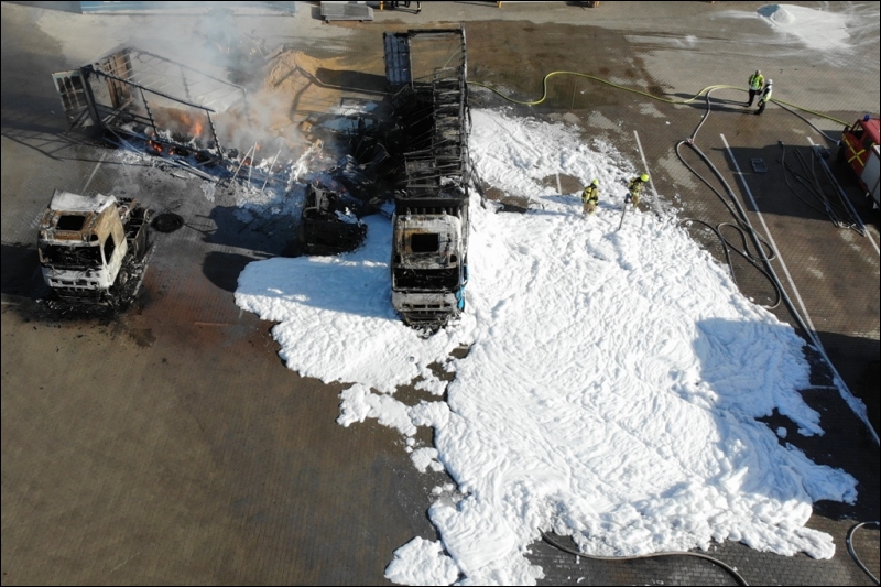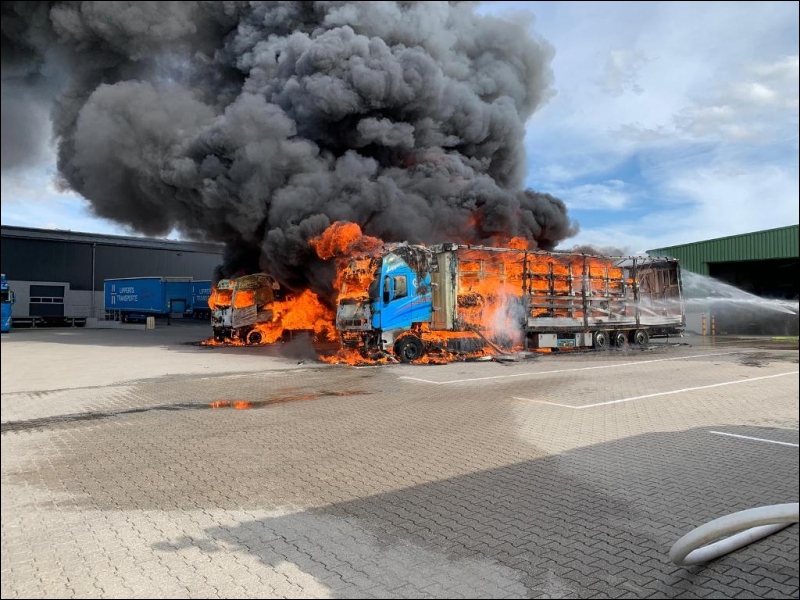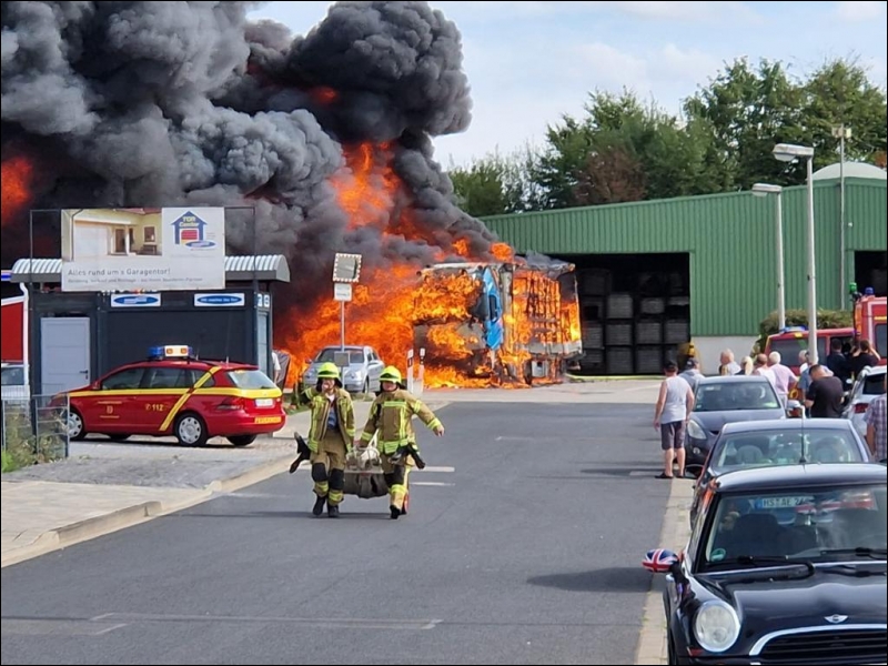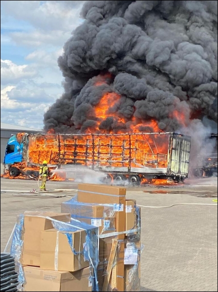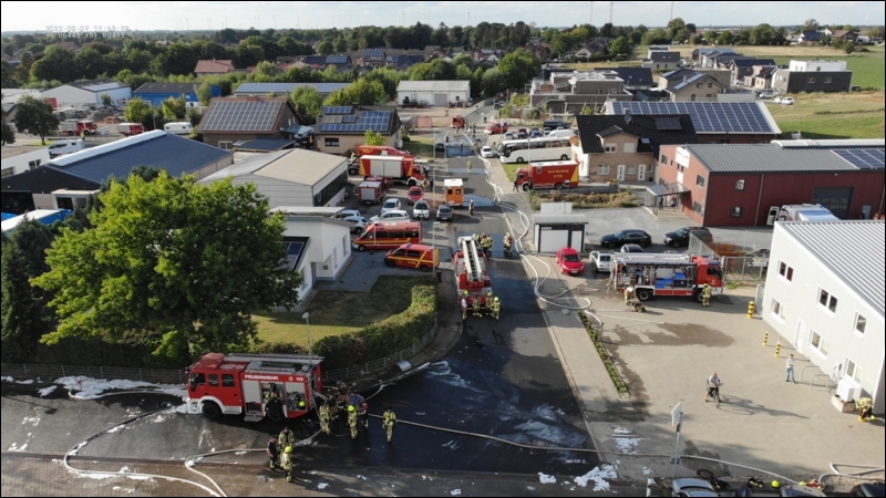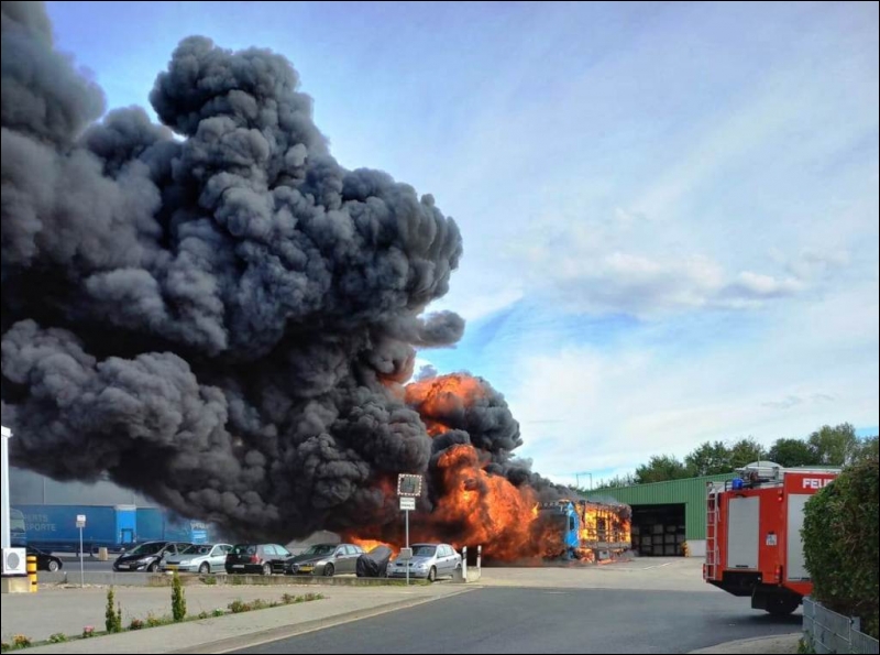 Die Feuerwehr Gangelt wurde heute Nachmittag um 15:31 Uhr zu einem Großbrand im Gewerbegebiet Gangelt-Birgden alarmiert. Dort standen mehrere Lastkraftwagen nebst Anhänger in Vollbrand.