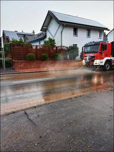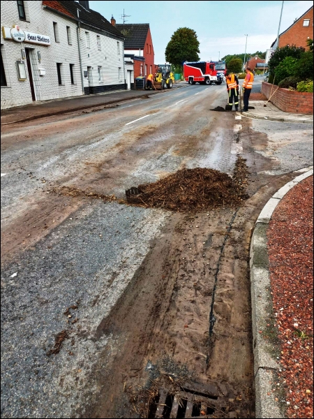 Vor Ort stellten die Einsatzkräfte fest, dass eine größere Menge Schlamm aus einem Wirtschaftsweg auf die Fahrbahn der Bundesstraße gespült worden war. Die Feuerwehr sicherte die Einsatzstelle und beseitigte unter anderem mit Hilfe eines Radladers des Bauhofes der Gemeinde Gangelt die Gefahr.